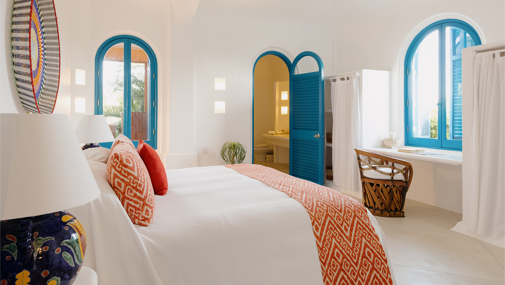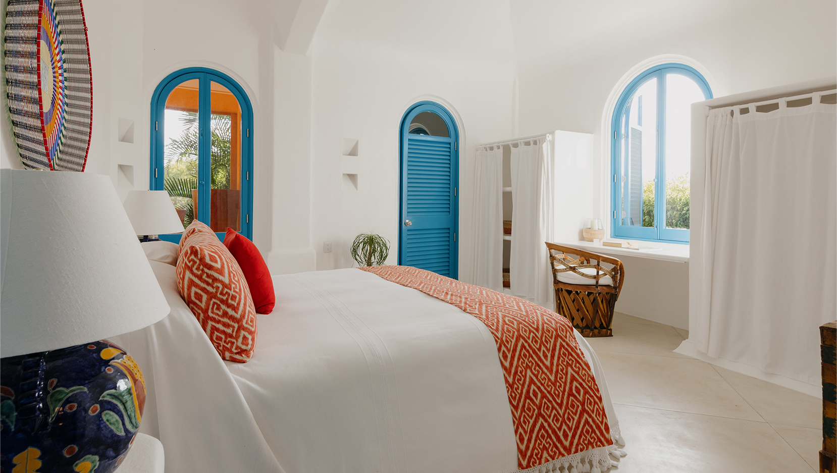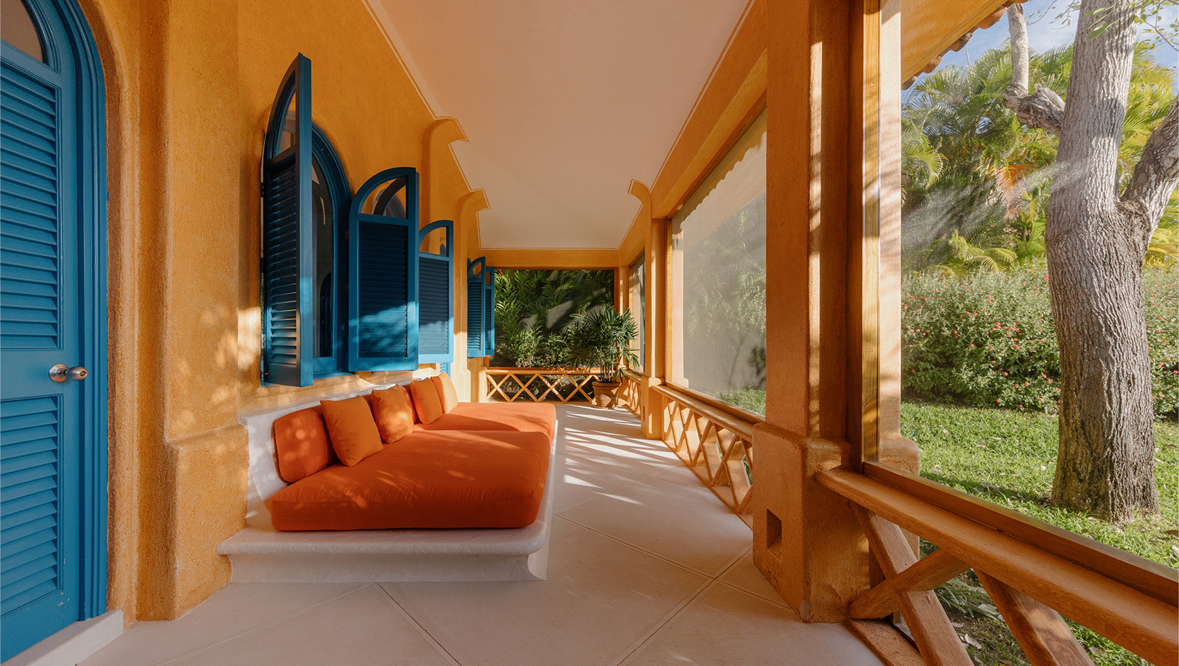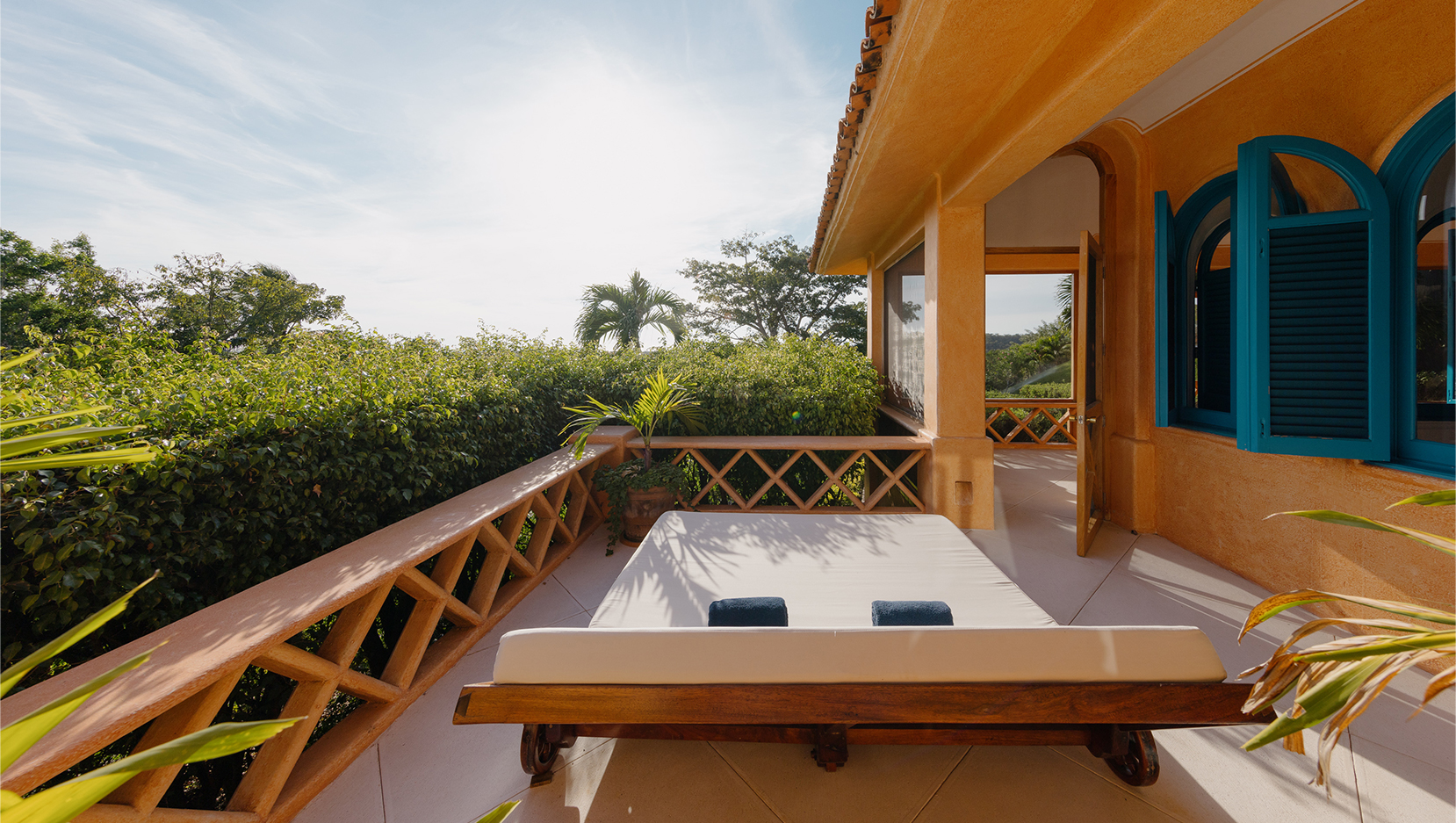 Vibrant colours, patterns and textiles are abundant in Casita Bugambilia. A joyful interior perfect for families or groups of friends, shuttered windows from each room open onto the wraparound terrace, offering views across the lush jungle landscape. In close proximity to the shared pool, guests have a plethora of relaxation options available to them after long days spent exploring the estate and all of the experiences on offer.