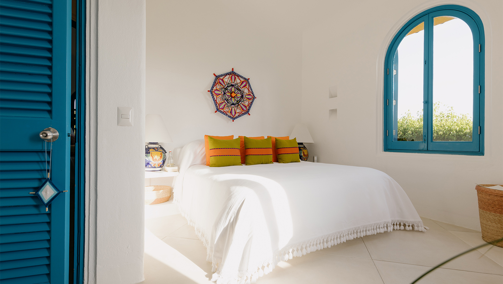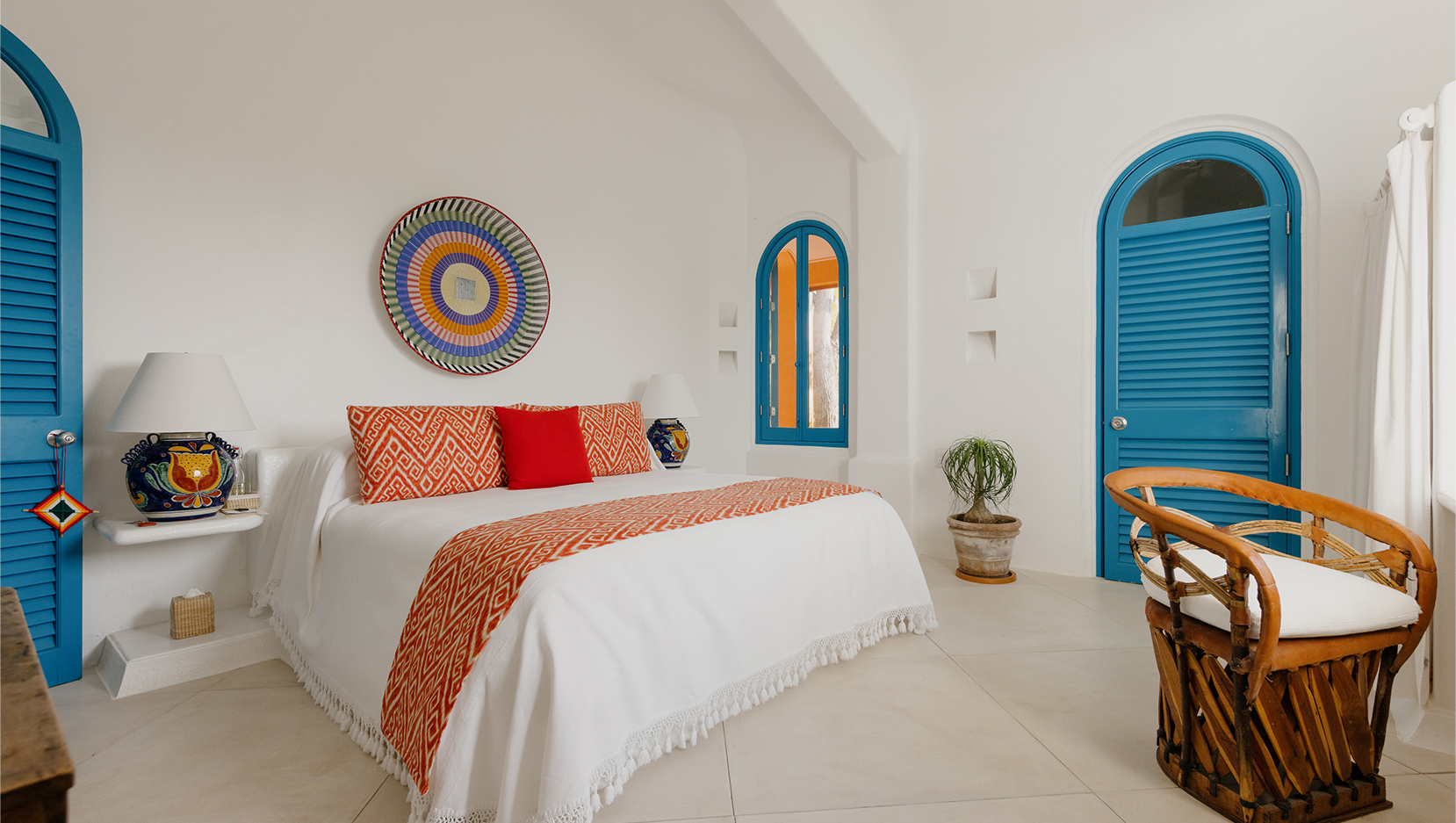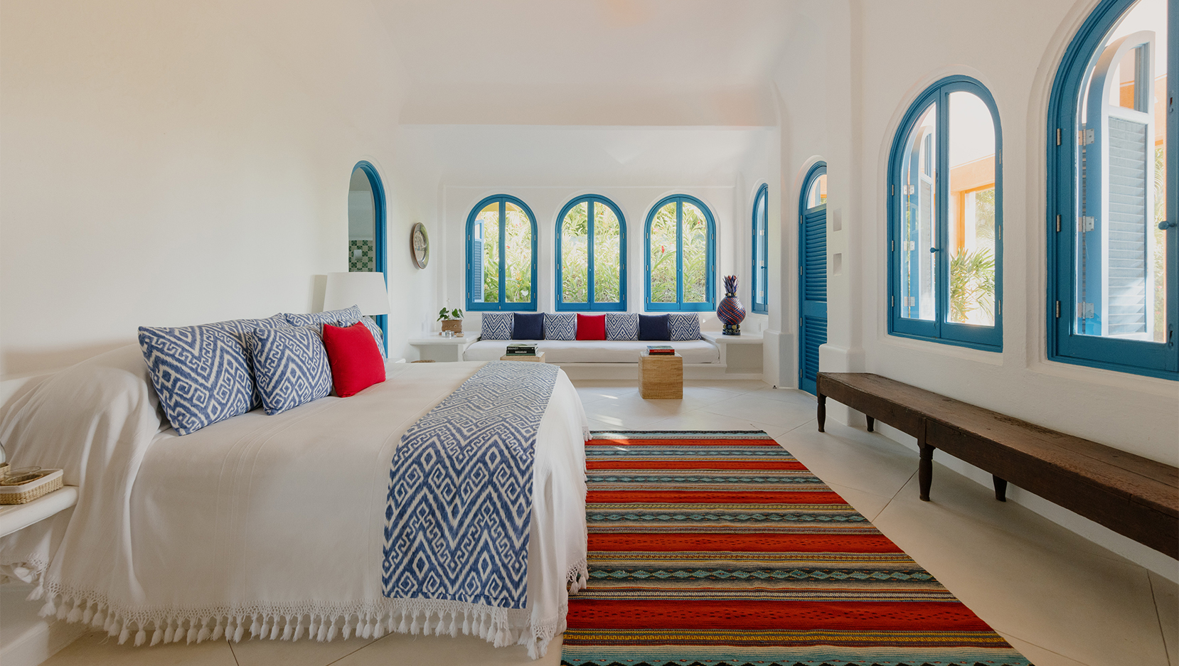 Vibrant colours, patterns and textiles are abundant in Casita Bugambilia. A joyful interior perfect for families or groups of friends, shuttered windows from each room open onto the wraparound terrace, offering views across the lush jungle landscape. In close proximity to the shared pool, guests have a plethora of relaxation options available to them after long days spent exploring the estate and all of the experiences on offer.